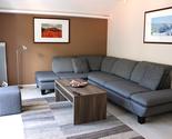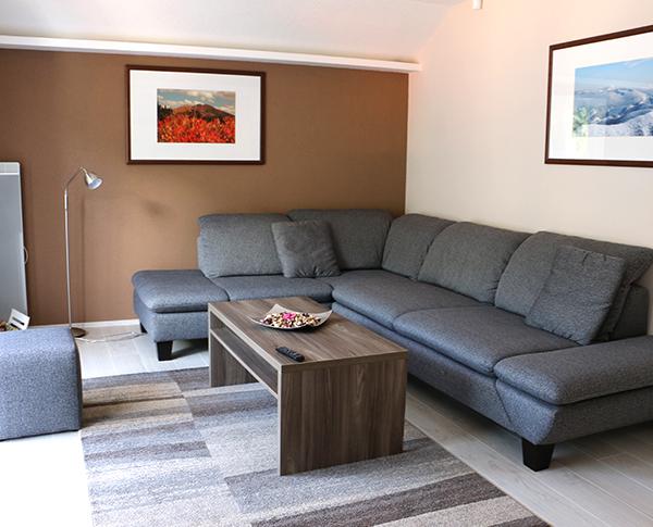 | Living room | with large corner adjusting sofa for 6 persons including stool, coffee table, floor lamp, flat screen TV 117 cm, wine fridge |